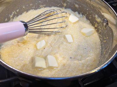 Add the cut pieces of butter to the polenta and stir it as it melts.