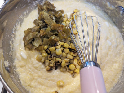 Add the chopped green chile and roasted sweet corn and stir until they are blended throughout the polenta. Just a quick note. If using frozen or canned corn, make sure to drain the excess liquids before adding to the polenta. This goes for the green chile as well.