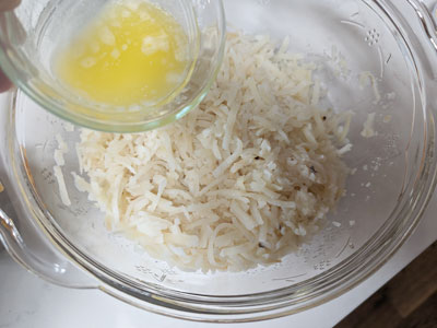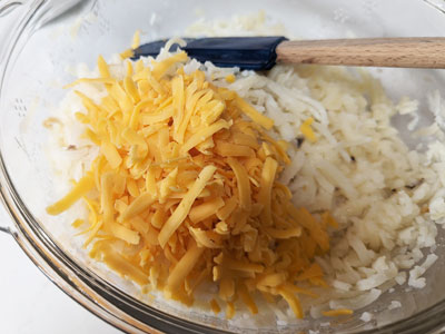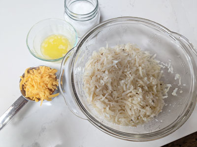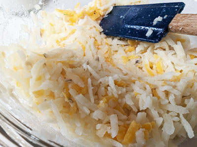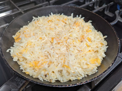 I’ve found that for myself the easiest and tastiest hash browns are made with dehydrated hash browns. One carton box will make enough hash browns for both Joe and myself. Costco has packs of 8 cartons reasonably priced that I tend to keep on hand. Pour hot water inside the carton to the fill line and wait 12 minutes. Drain any excess liquid and they are ready to go. Here I have the rehydrated hash browns, 2 tablespoons of melted butter, 1/2 cup of cheddar cheese and salt.