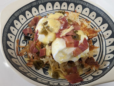 To assemble, place half of the hash browns on the bottom of a plate or bowl. Add 2 poached eggs and spoon as much of the hollandaise sauce that you want over top. Sprinkle with bacon bits and chopped green chile.