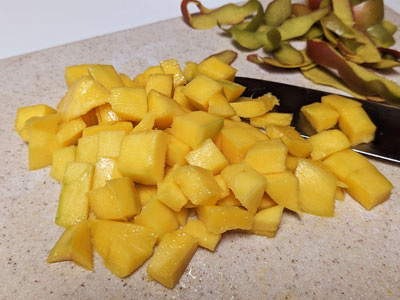 When the mangos are soft to the touch, peel and cut into small cubes.