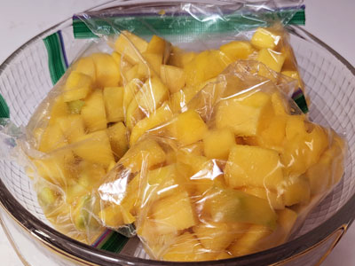 Package 4 cups of mango’s in zip lock bags and freeze them. I usually buy mango and pineapple on sale to put up in the freezer, that way any time I want a smoothie or frozen margarita it’s frozen and ready to go.