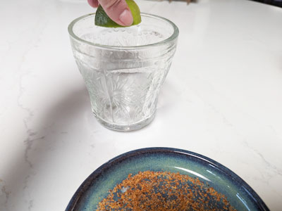 Prepare glasses: Sprinkle Tajin seasoning on a plate. Use a lime wedge to run along the glass, then dip the rim of the glass into the Tajin and roll to coat the outer edge of the glass.