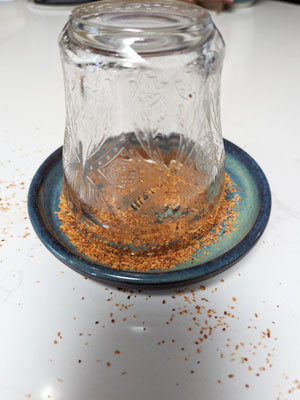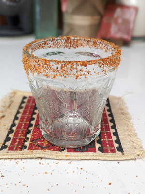 Sprinkle Tajin seasoning on a small plate and place the glass upside down and roll around the outside edge to coat the glass with the seasoning.
