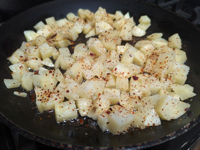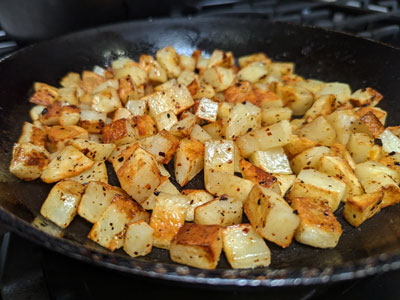Add 1 -2 tablespoon of bacon grease or oil to a 10 inch skillet, cast iron or non stick both work well. Heat the oil over medium heat, then add the cubed potatoes. Sprinkle with Red Chile Salt. Stir the potatoes often to cook over all sides approximately 10 minutes give or take until they are crispy. If they begin to burn, turn the heat down.
