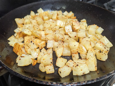 Fry potatoes over medium heat turning them often as they begin to crisp. I would guess it takes approximately 10 minutes. I’ve been making these so long I don’t time it but rather judge by how they look, brown and crispy on the outside.