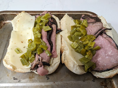 To assemble Duke City French Dip: Open the soft rolls out onto a baking sheet. Place cheese slices on both sides of the roll. Place 2 – 3 slices of rare roast beef over one side of each sandwich and 1/4 cup of chopped green chile on the other side. Place under the broiler setting of your oven or toaster oven a few minutes just until the cheese melts and toasts the roll around the edges.