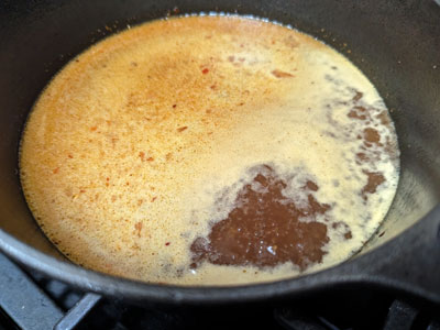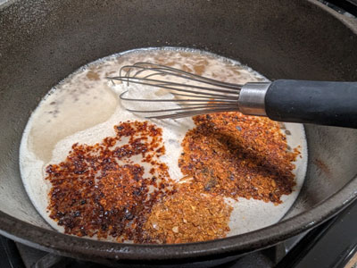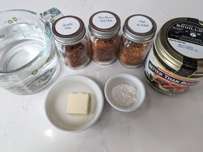 Add the water and whisk until all the Better than Bouillon is dissolved, add 2 cups of water and stir until it resembles a thin gravy. Add the ground red chiles and stir until it’s incorporated into the au jus.
