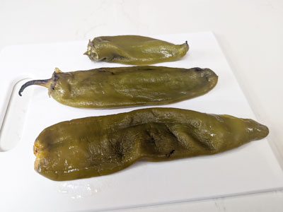 I’ve roasted some green chile to put on the sandwich. Once roasted, I placed it in a plastic bag to steam it out for 20 minutes. The steam helps to loosen the skin and it will peel easily.