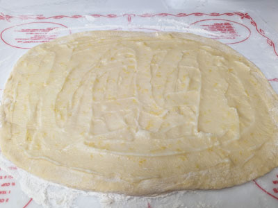 Take half of the filling and use a pastry spatula to spread the lemony filling over the dough.