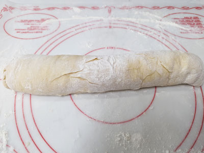 When dough has doubled in bulk, punch down the dough and using your previous works space knead the dough until it is easy to work with.  Divide the dough in half and shape into 2 rectangles.   Take one rectangle and roll out to approximately 1/4 inch thickness.