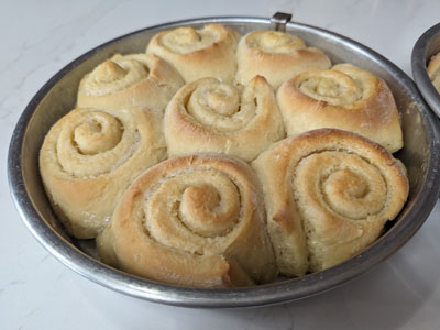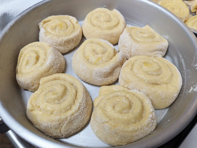 Prepare two 9 inch baking pans by spreading a pat of butter around the bottom and edges inside the pan. Place the cut rolls inside the pan allowing space around each roll to expand as they rise. Place a cup towel over the rolls, place in a warm place and allow to double in size.