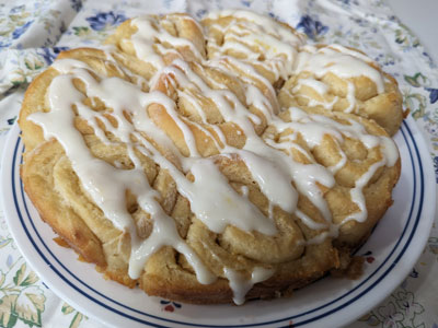 Place a plate over the baking pan and turn over. The rolls will be upside down so place another plate over top and flip over so that the rolls will now be upright. Drizzle the lemon cream cheese glaze over the rolls and serve.