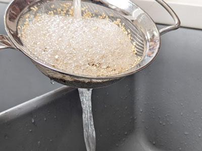 You can see while rinsing the quinoa the amount of bubbles that form as soon as the water hits the grains. It took a good 90 seconds to 2 minutes before it ran clear.