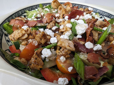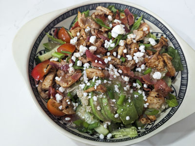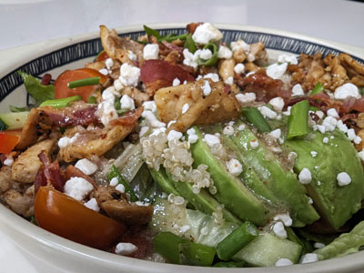 Assemble your salad with chopped romaine lettuce on the bottom. Add your favorite toppings including sliced tomatoes, sliced cucumbers, sliced red bell peppers and sliced avocado. Top with cooked chicken, bacon bits, sliced green onion and goat cheese crumbles. Finally, spoon some quinoa over top and drizzle with vinaigrette.