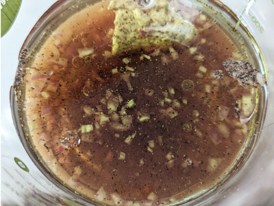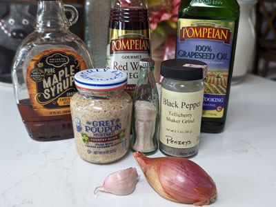 I’m going to start with the vinaigrette so that it has time for all those flavors to meld together. It’s a simple vinaigrette with red wine vinegar, maple syrup, grapeseed oil, dijon mustard, salt, pepper, minced garlic and shallots. After experimenting with different flavors, I found the taste of maple syrup was a game changer over honey, agave or other sweeteners. I also tried a substitution of grapeseed oil for olive oil. The neutral taste of the grapeseed oil allowed the flavors to come out and whereas the olive oil seemed to overpower the flavors.
