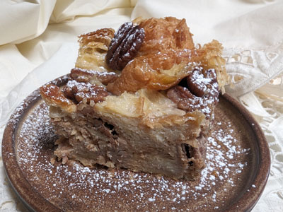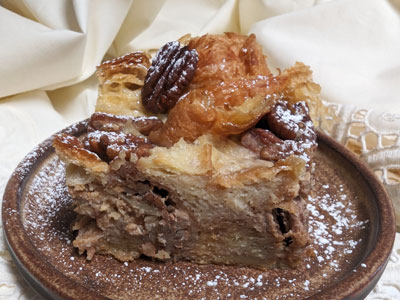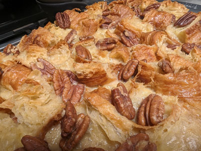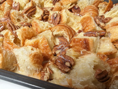 Gently pour the custard evenly over the croissant cubes and pecans.