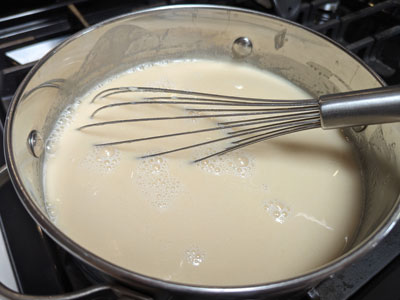 Once the butter is melted and the sugars dissolved, add the milk, half and half and heavy cream.