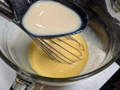 Whisk the eggs together and ladle warm cream into the eggs. Whisk as you add the liquid to temper the eggs. Continue until you’ve incorporated all of the liquid.