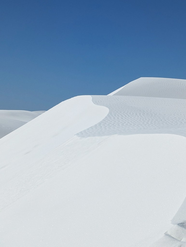 It’s that time of year when Joe and I come out of hibernation to spend our free days finding new adventures in New Mexico. We decided to travel down south with our first stop being White Sands National Park. Our day at White Sands was one of the most memorable days ever. Located in the Tularosa Basin lies the world’s largest gypsum dunes. Over millions of years wind and water have eroded the gypsum into fine grains of sand. You will find soft pillowy sand dunes as well as hard packed areas. There are sculptures formed around hearty vegetation that grows here. What I especially loved was the swirly patterns in the sand created by the wind. The path is marked by footprints and markers along the way to keep you on trail. When you arrive at one marker you will see another marker in the distance so you know which direction to follow. Walking through soft sand is not easy. Always take enough water as there are no water stations to refill except at the visitor center which is several miles away. Wear light colored clothing and use sunscreen as the temperature can feel much warmer than the actual temperature. Make sure you are prepared to walk in sand, it is a slow trek and difficult to climb the numerous dunes with one step forward while sliding a half step back. But hiking down hills are so much fun, Joe and I held hands and ran down the dunes like little kids. Every step down would sink up to our knees filling our shoes with sand, but it was a small price to pay. I wish everyone could experience White Sands at least once, the stark beauty will take your breath away. I know that Joe and I are already planning our next trip to White Sands where you can’t feel anything other than awe and wonder!