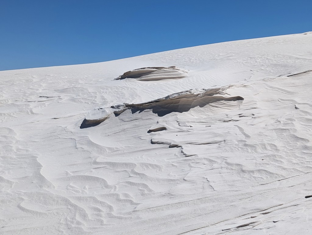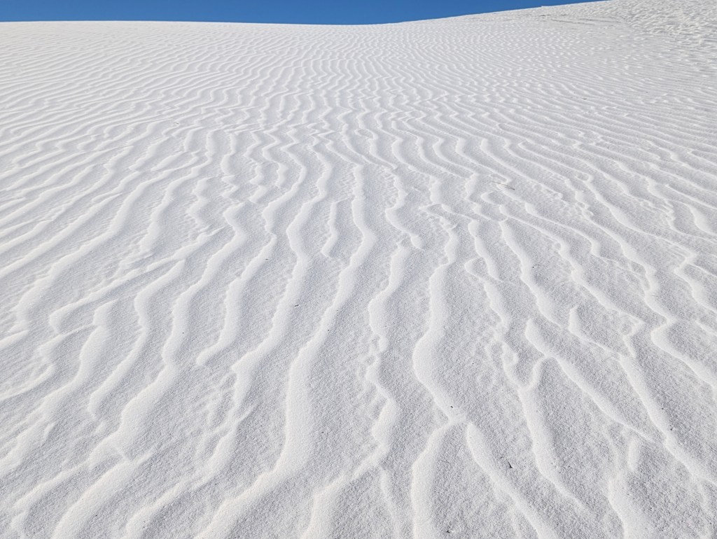 You will find many areas where the wind makes these wavy lines in the sand. It’s so beautiful with just white sands and blue skies. There were very little clouds in the sky on this day and there were varying shades of blue skies all around us.