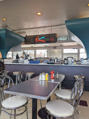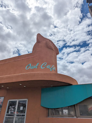 The Owl Cafe – Chile Cheeseburger . . . The Owl Cafe has 2 locations, the original Owl Bar & Cafe in San Antonio, NM and The Owl Cafe in Albuquerque. We haven’t been to the original Owl which some New Mexicans claim have the best burgers. The Owl in ABQ has a nostalgic diner vibe with an oval counter with bar stools, a small jukebox in every booth, checkerboard floors with metal tables and chairs and a pie safe that takes you back in time. The wait staff bring out a small bowl of pinto beans with green chile and crackers before you order. You may think it odd, but that’s the way they’ve always done it. Once you get a bite of the green chile, you know it’s gonna be good! The Owl burgers are consistently good; we’ve been numerous times and there’s never been a time when I wasn’t wowed! You get the biggest bang for your buck with these burgers, at just $6. The fries are ordered separate and 1 order is enough for 2.