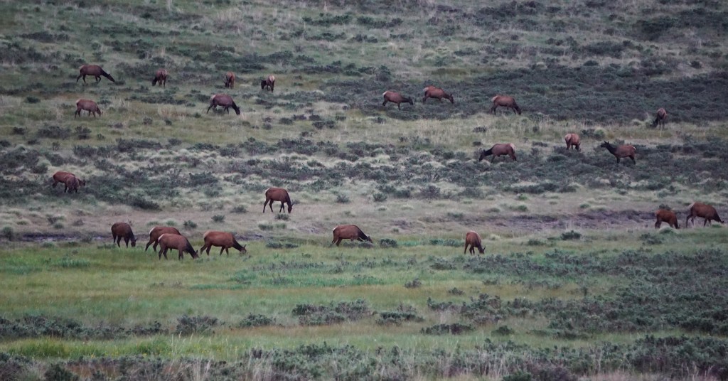 Just south of the turnoff to the preserve there is a pullover spot for elk viewing. We always stop but rarely see them. On this day, however, there was a small herd grazing in the distance.
