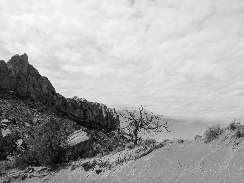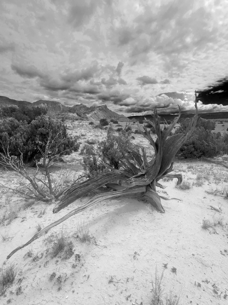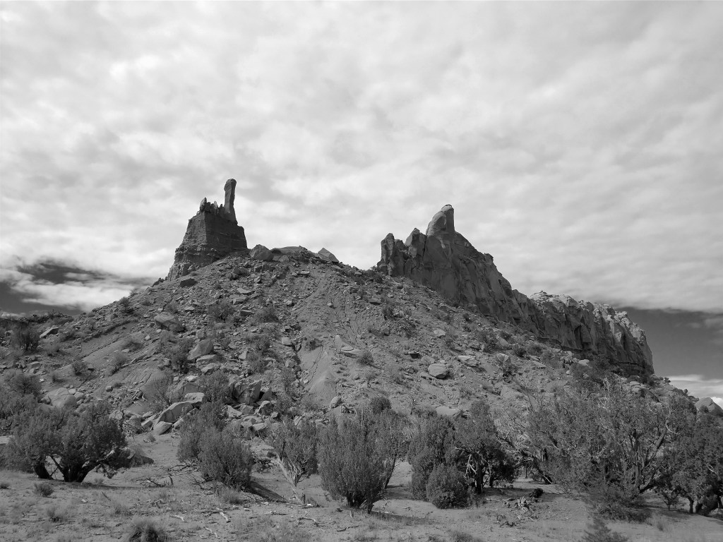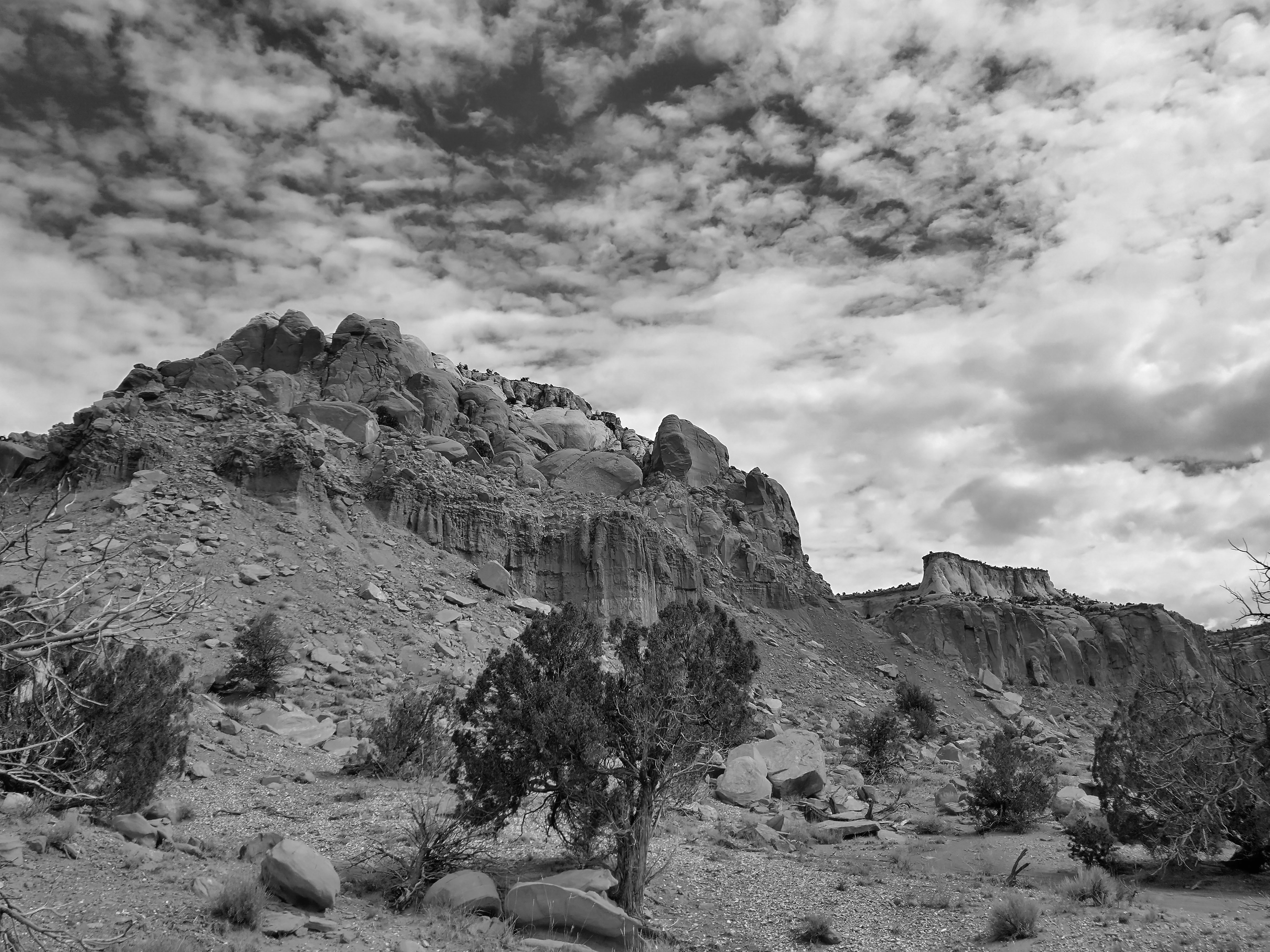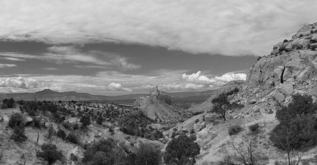 This post is a bit different from my usual travel posts. I thought these photos would be worthwhile in black and white, but I had no idea the dramatic effect they would have. While traveling and hiking across New Mexico, I try to showcase the colors, textures and landscapes that I find quite beautiful. On this day we attempted to find the elusive Talus Slot Canyon. This was our second attempt and both times we’ve failed, however it was one of the most beautiful days I’ve ever experienced. The summer monsoon had drenched the thirst of our arid landscape turning it from a wheat color to vivid green. The clouds were abundant in every shape and size giving the landscape a moody atmosphere. As we headed out we were aware that it might rain at any moment, so we took caution as the Talus Canyon Trail is an unmarked trail through a dry creek bed and rocky areas. On Hwy 84 just a mile or so past the turnoff to Abiquiu Lake there will be a picnic/parking area on the south side of the highway. Park here, then walk across the highway to find the trailhead. There is a visible footpath but if there has been any recent rainfall, the footprints are likely to be washed away so be aware and use your trail app. Once you head back into the Talus Canyon the view is breathtaking. Whether in color or black and white, the Talus Canyon Trail is one of my most treasured places to hike.