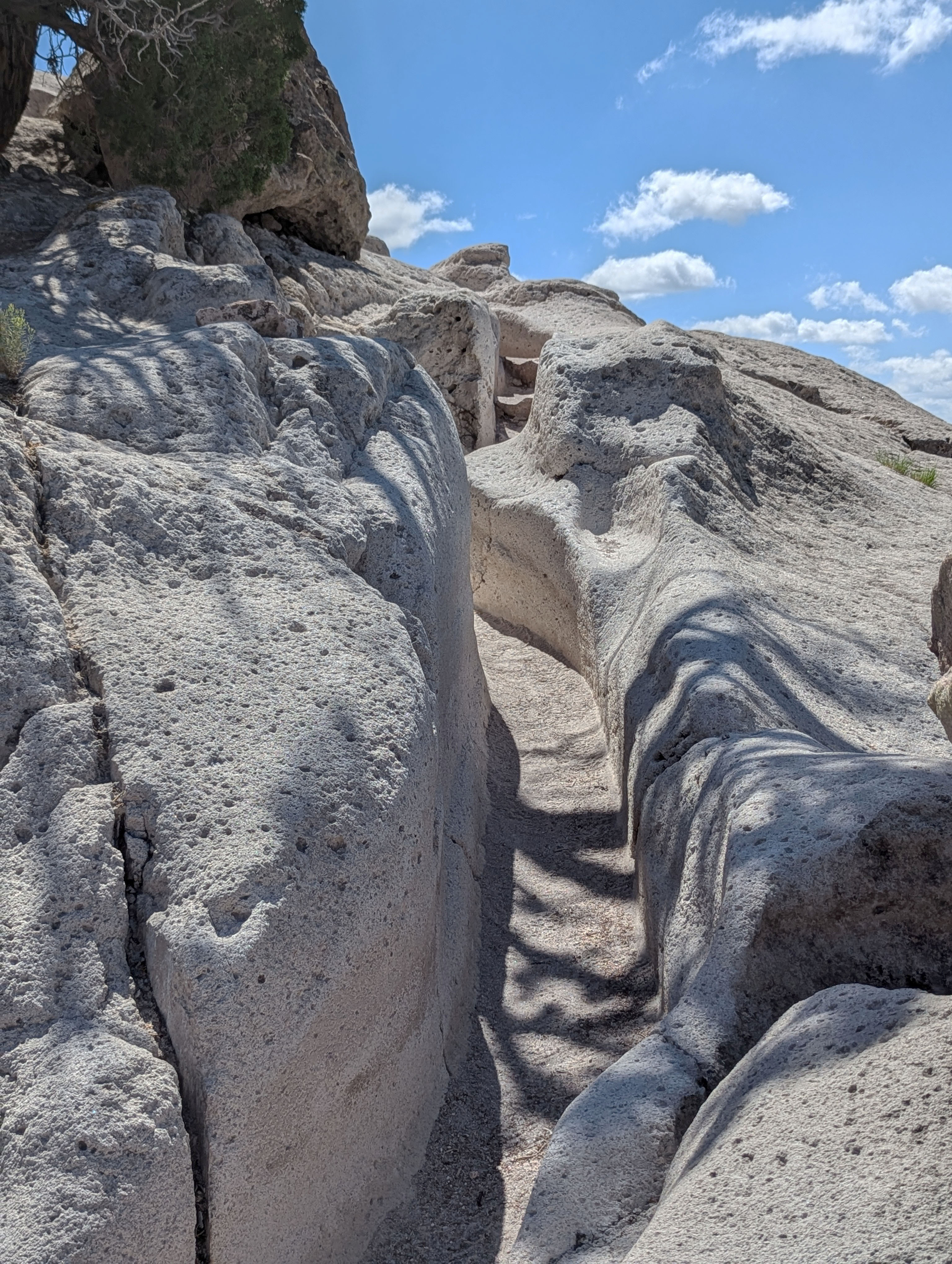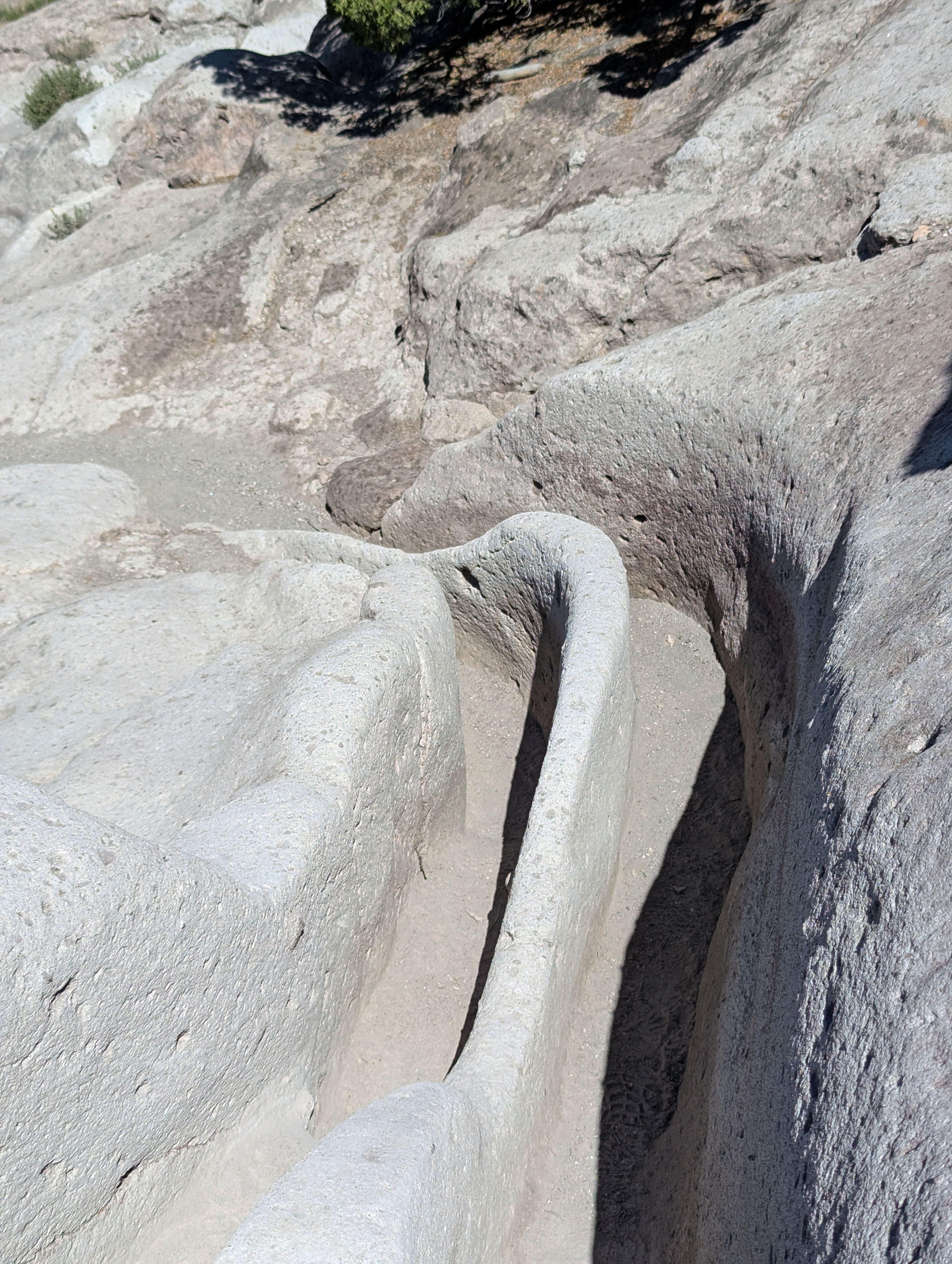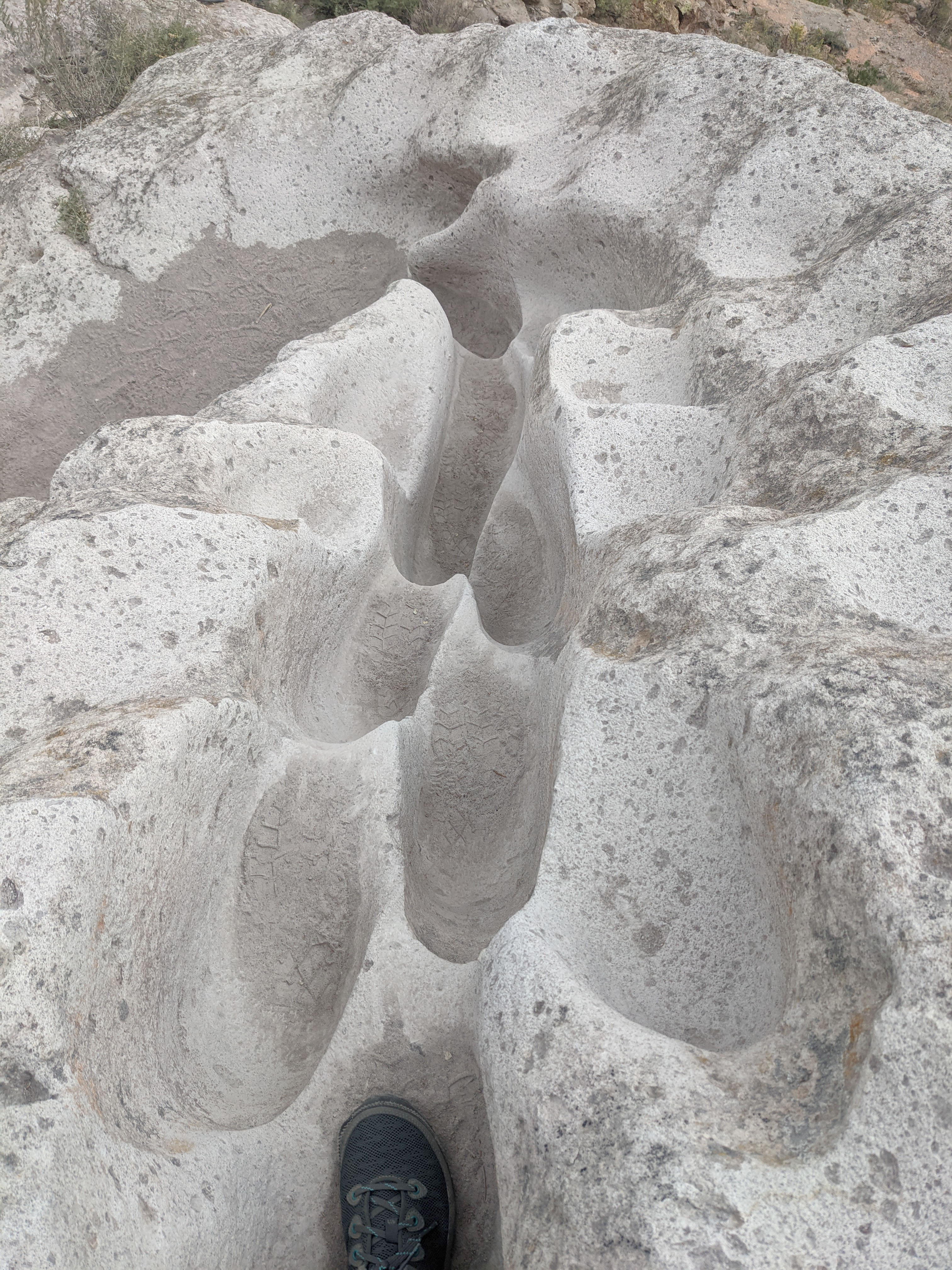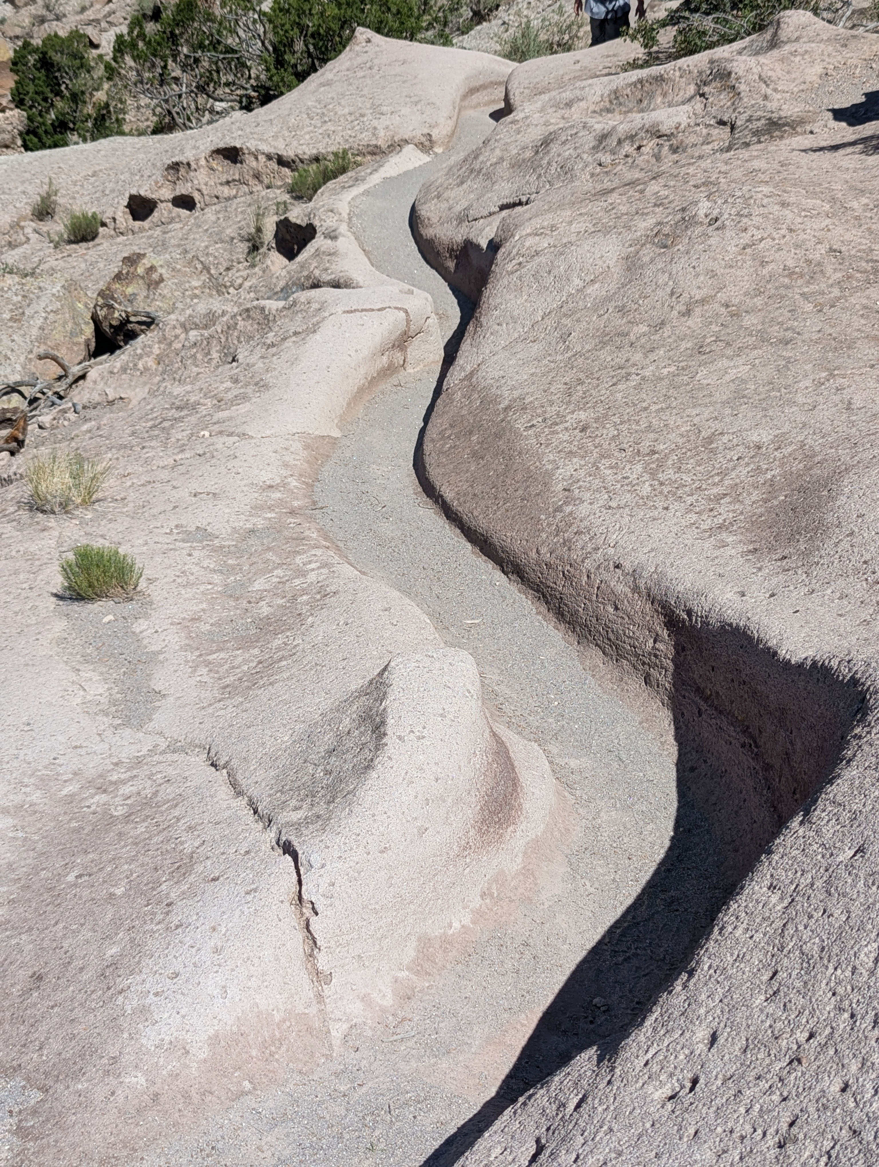 Here is an example of the walking path that has been carved over many years by the ancestral Puebloans. On top you can see the footprints while the path that leads you is the smooth trench around the soft tuff stone.