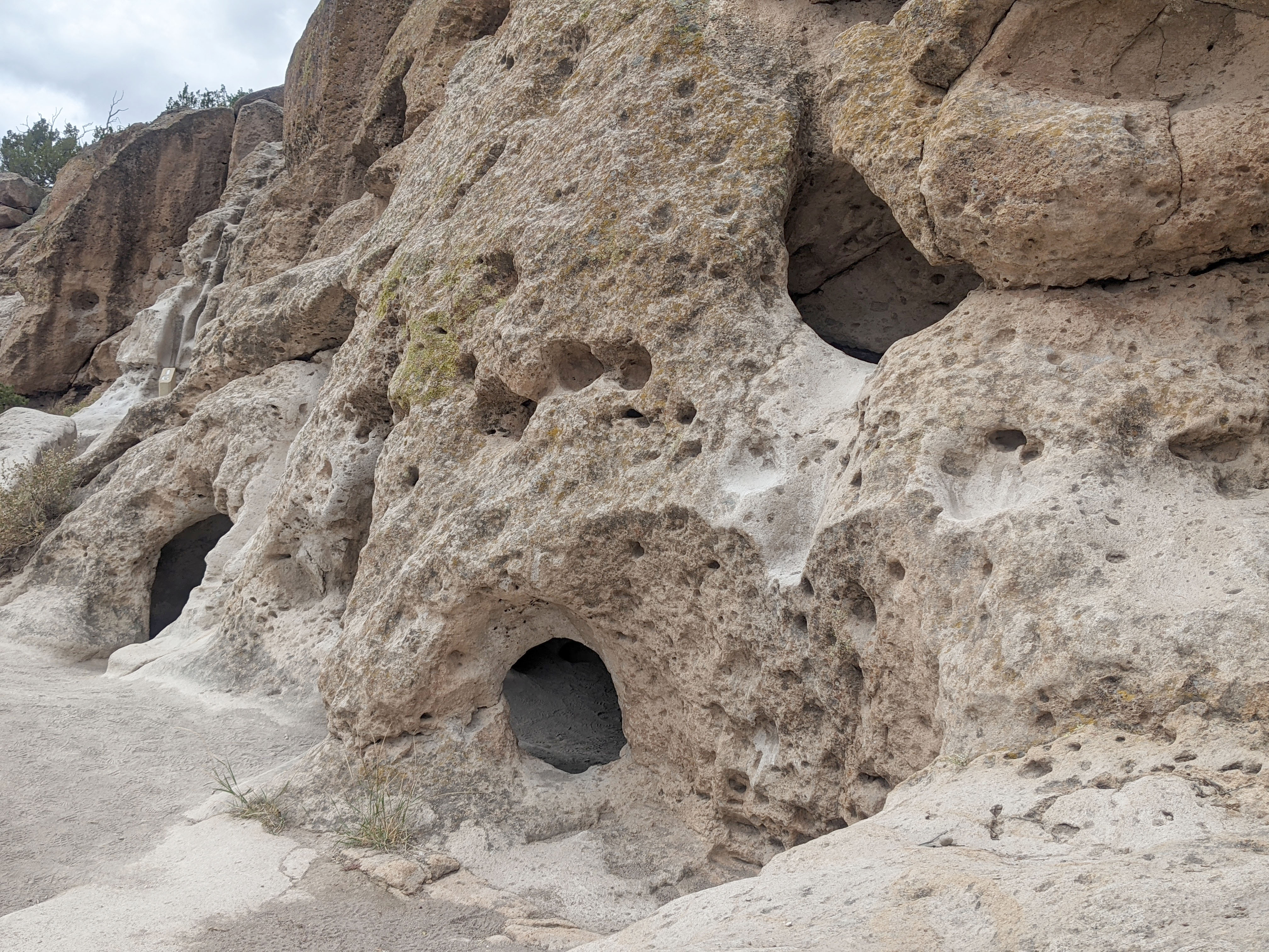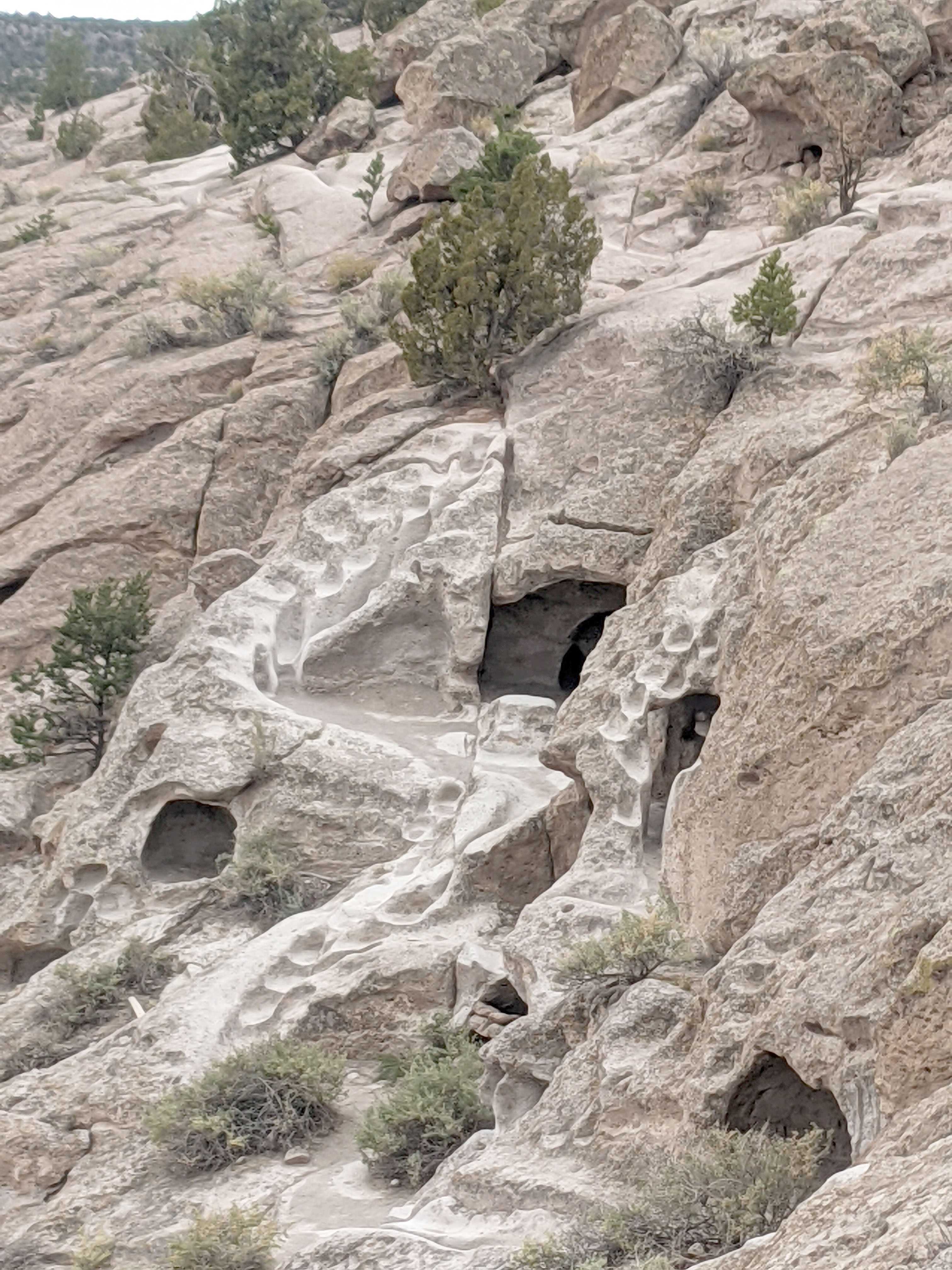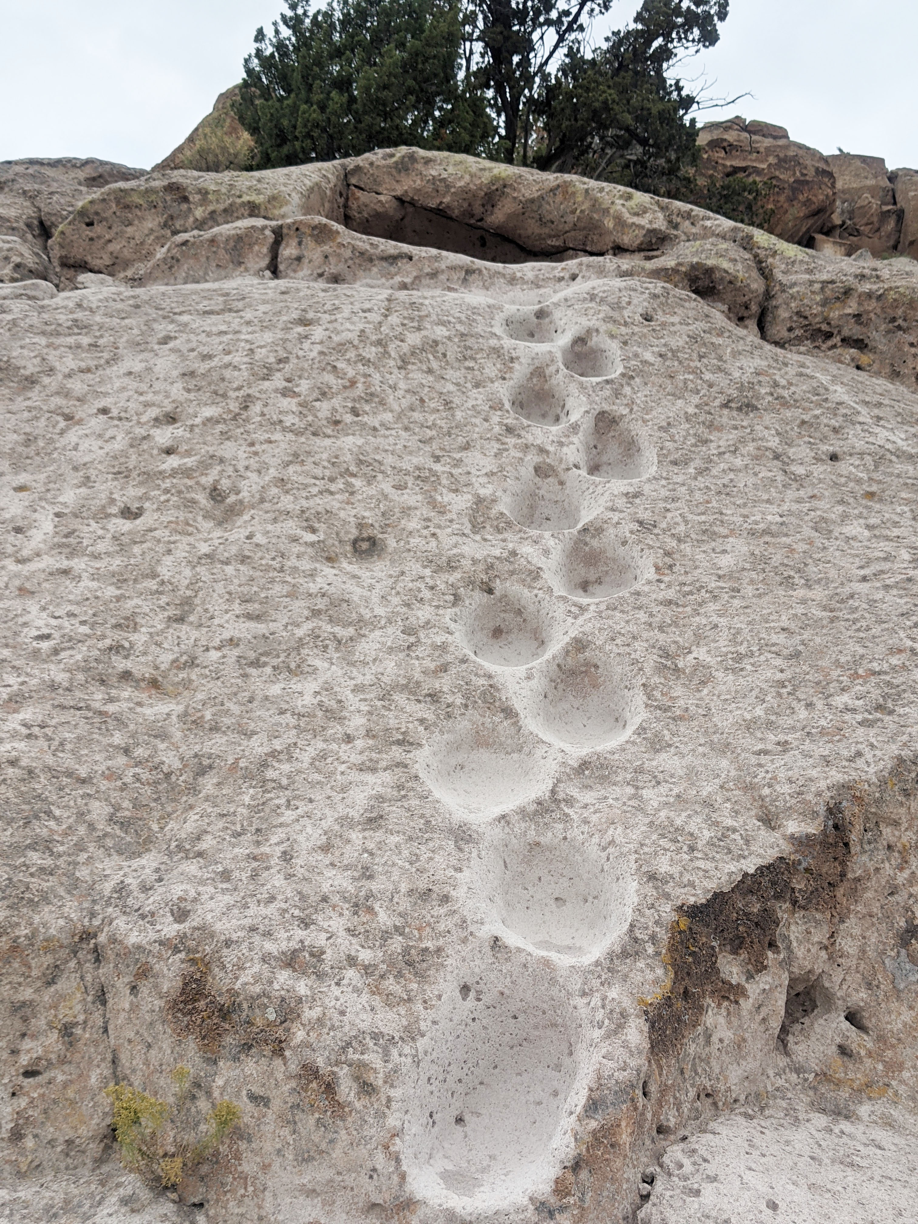 Here are some of the cavates that the Puebloans carved out for their homes. The top right photo shows the distinct footprints leading up and around the cavates where they traveled back and forth. The bottom left photo shows how deep the footprints are carved into stone.