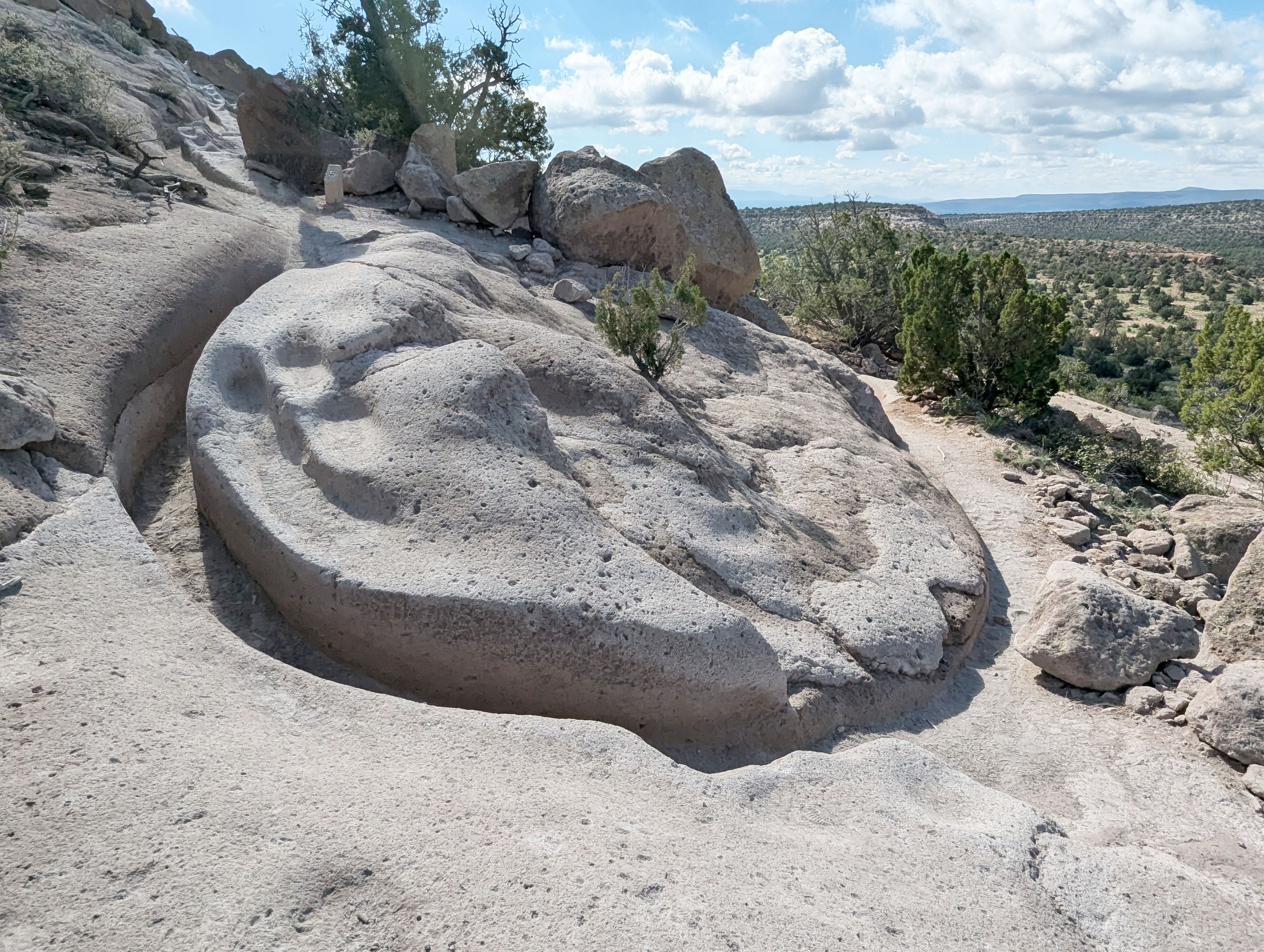 Here is an example of the walking path that has been carved over many years by the ancestral Puebloans. On top you can see the footprints while the path that leads you is the smooth trench around the soft tuff stone.