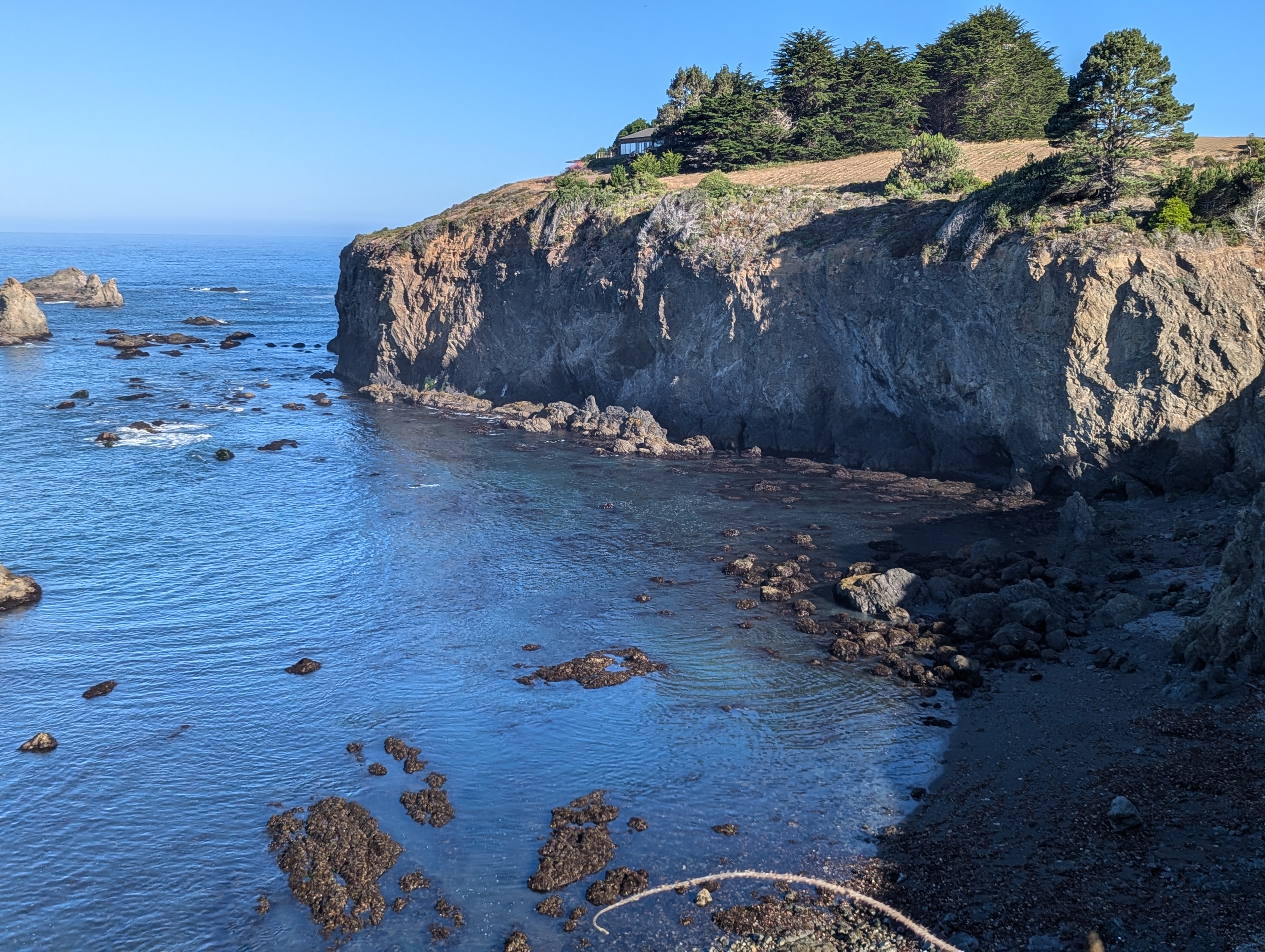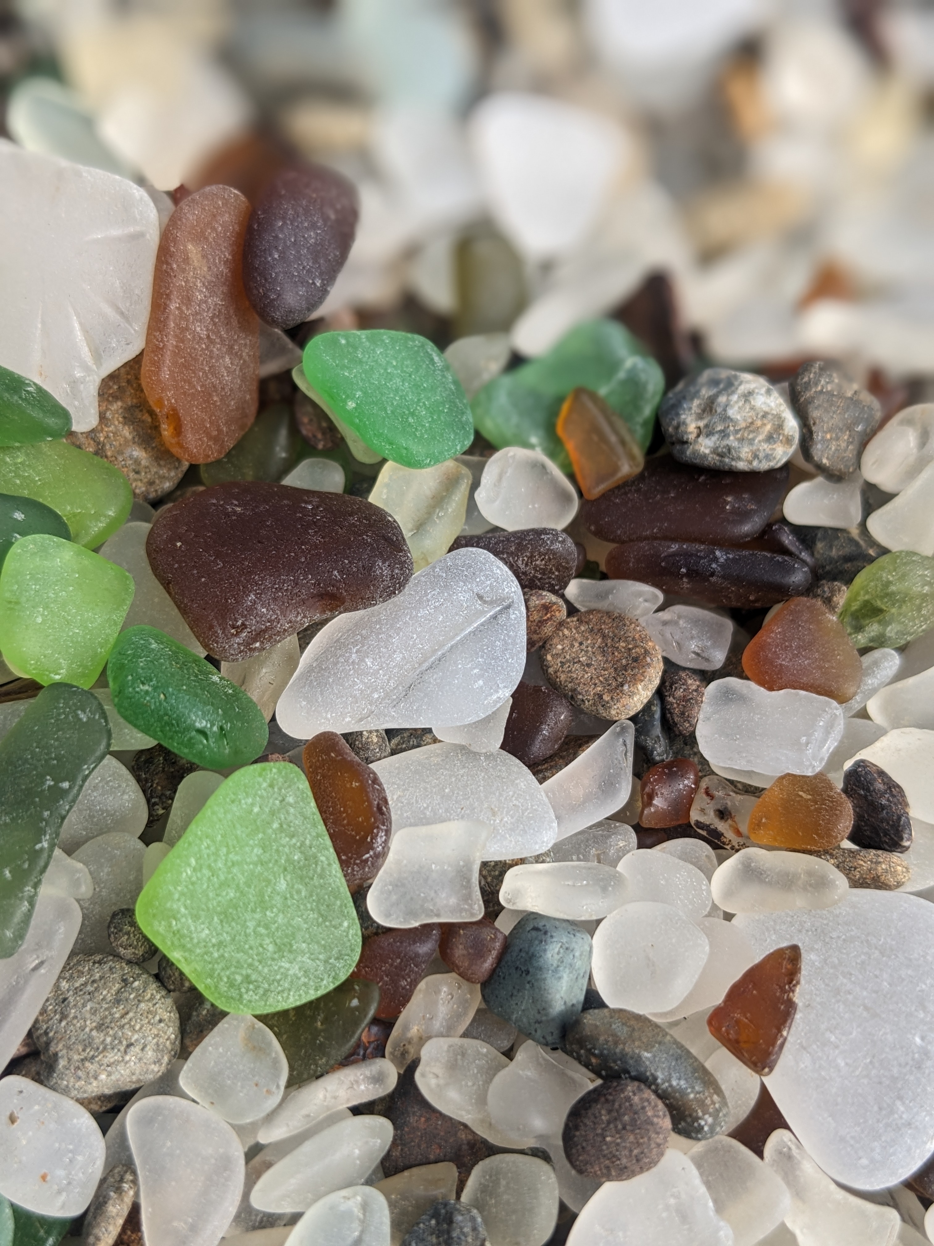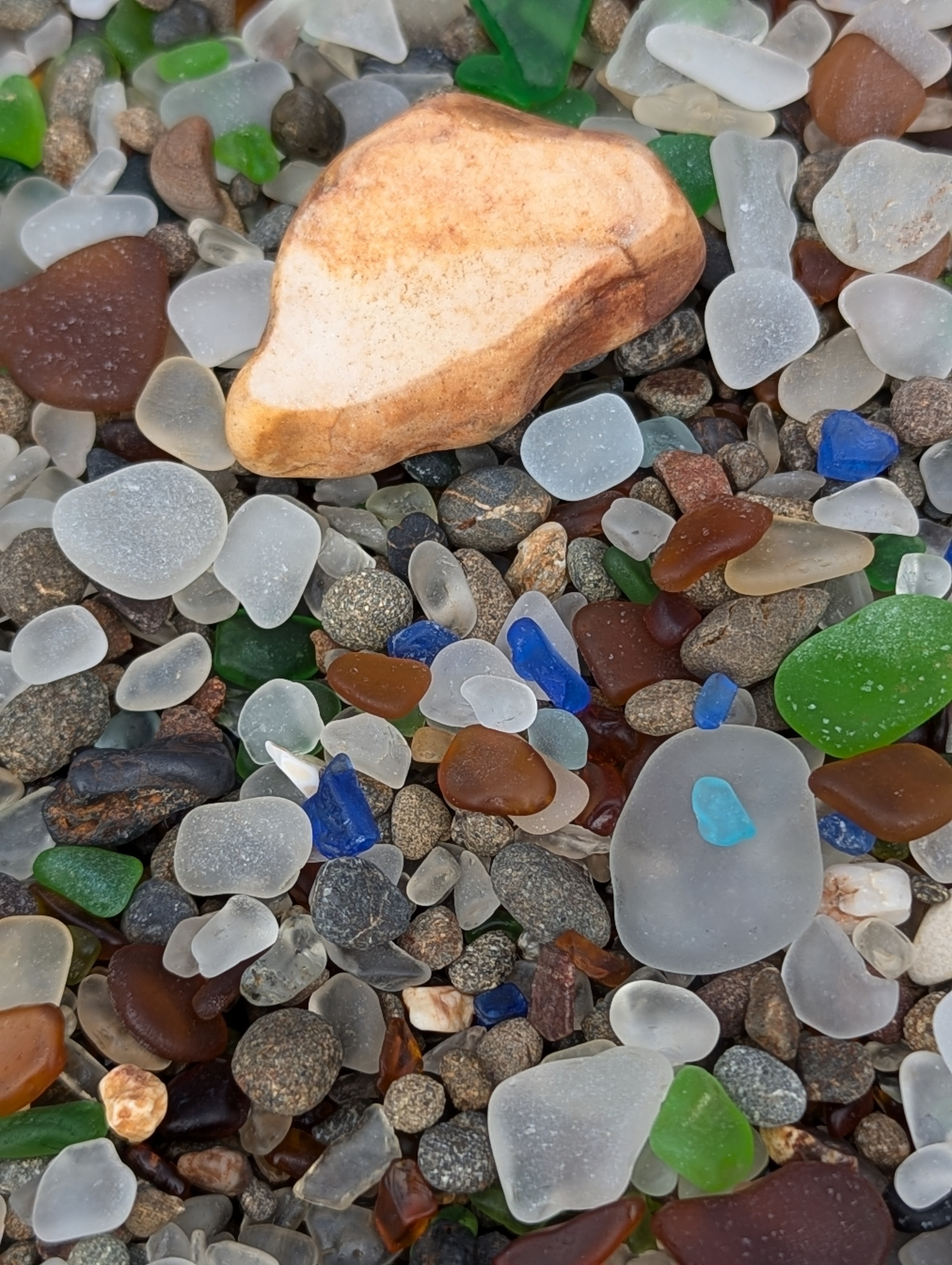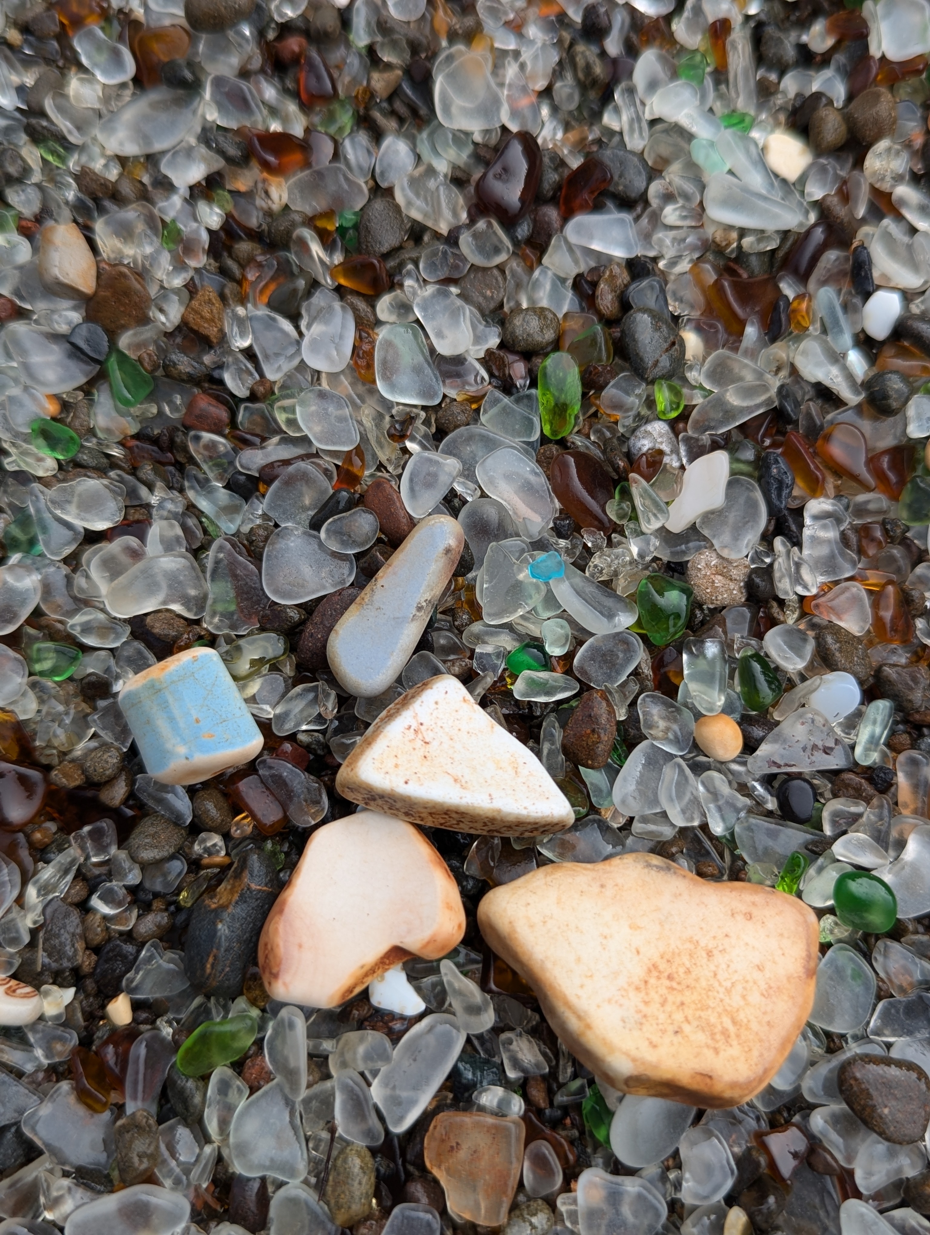 I’ve always wanted to see the sea glass beach and it was a highlight of our trip. I could have sorted through the glass for hours. It is magical when the waves go over the glass and it becomes translucent and the colors fairly sparkle. From up above you may think it’s just a pebble beach, but when you see it up close you begin to see the specks of green and brown among the white glass. And if you are lucky you will find a few tiny pieces of dark and light blue pieces. I found a peach colored piece but soon lost it; some of the rare pieces are so hard to find and if you drop it it just blends in with the rest. The bigger pieces are pottery or ceramic. They are so smooth and some still have the color that they were painted in.