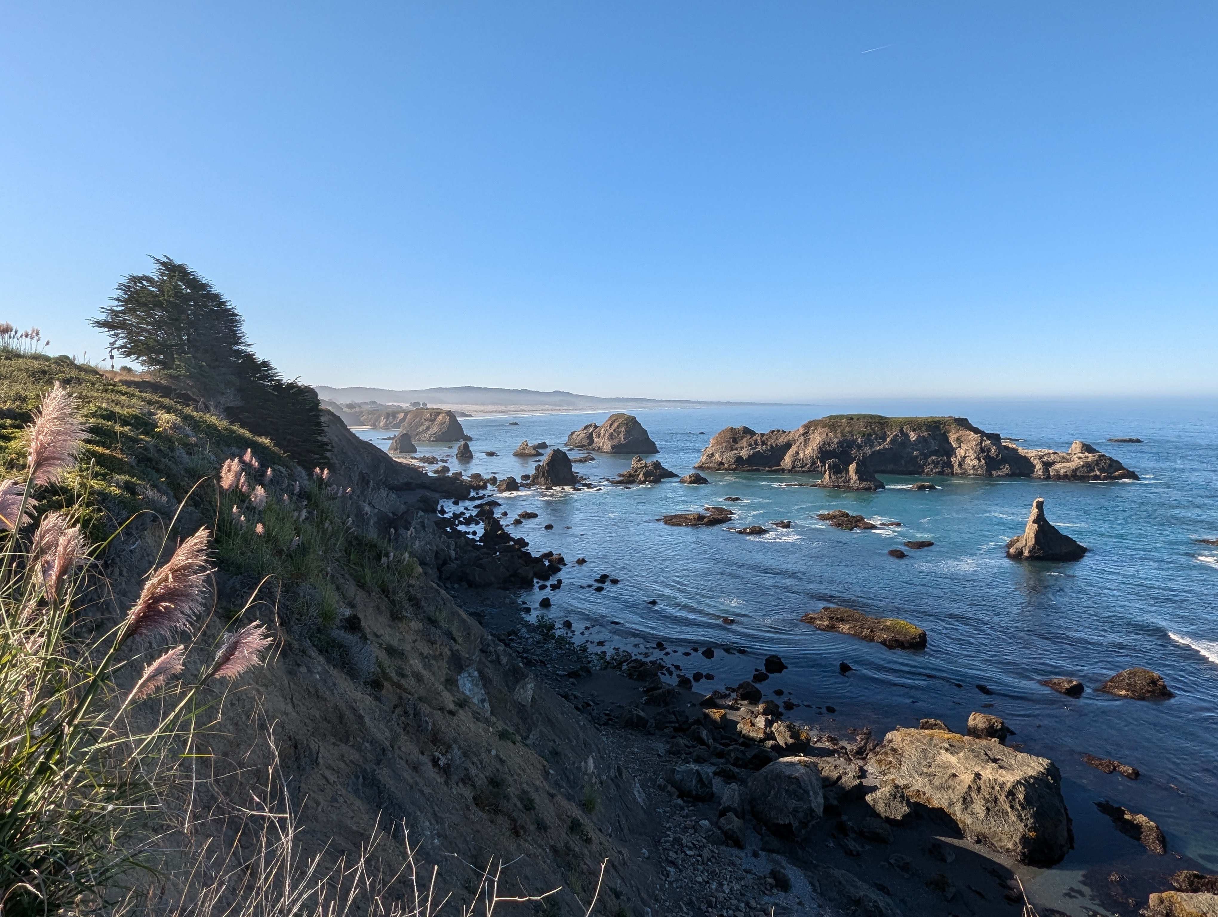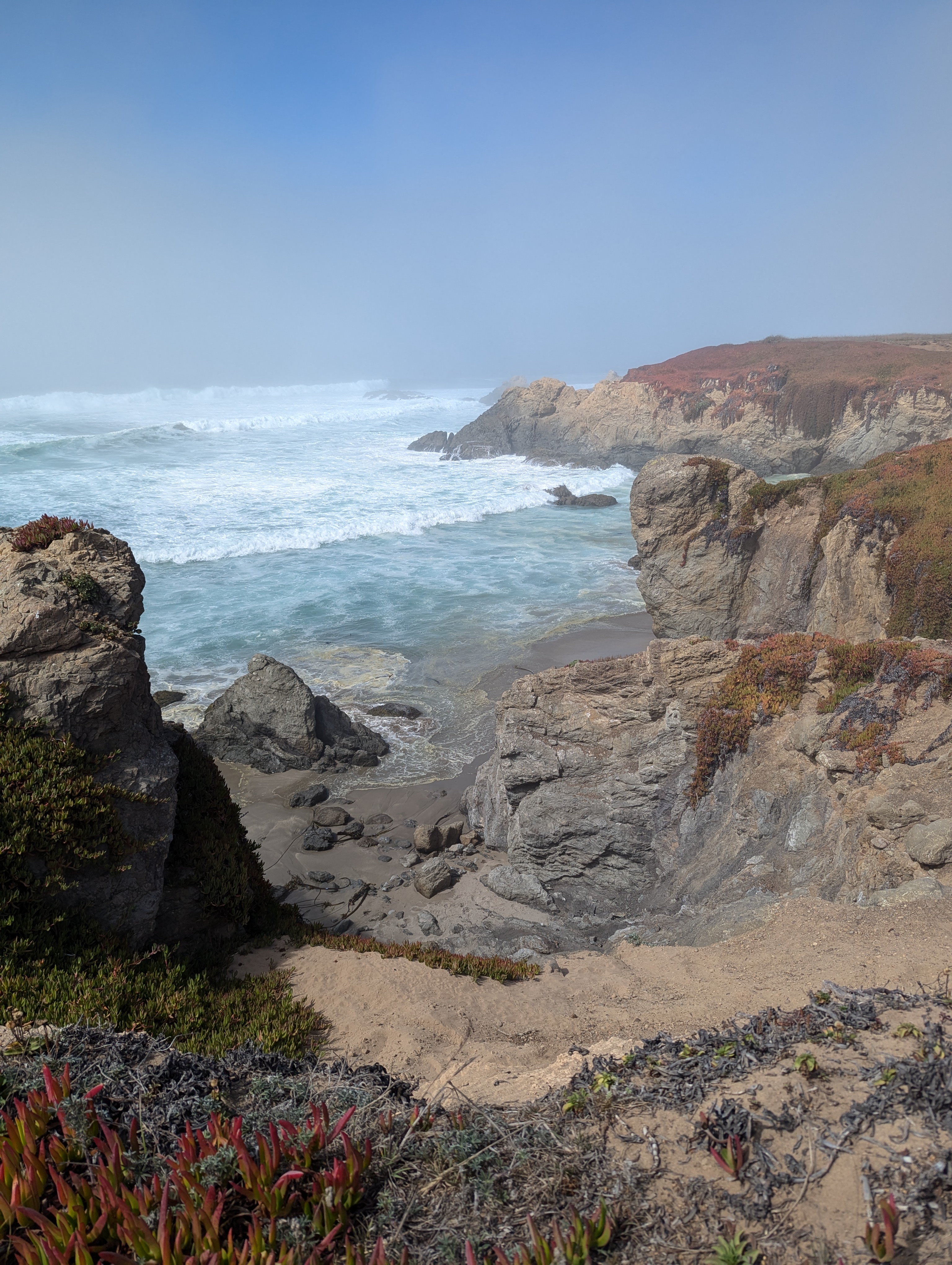 Each day the temperature was in the mid 60’s. Even though the wind would pick up now and again we rarely wore more than a long sleeve shirt and windbreaker. After lunch we would go for a walk along one of the many trails that follow the coast. We could see the fog in the distance but as as we walked it began to catch up to us and swirled around us. We could see the ocean close up but it was a gray fog in the distance. Even with the fog it’s quite beautiful.