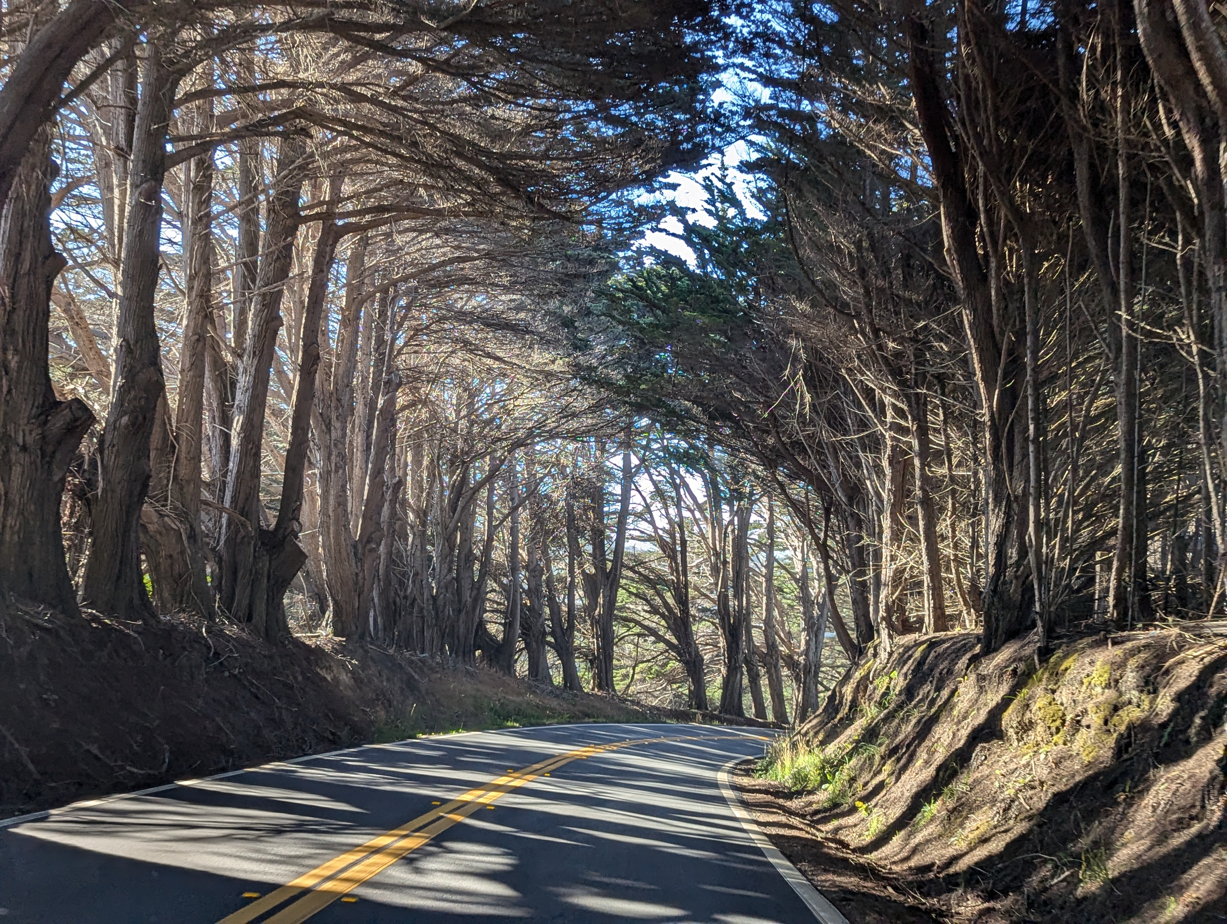 Westport is a tiny little community with only a small grocery store with a gas station, a few homes and vacation rentals. Each day we would travel south on Hwy 1 to Ft. Bragg or Mendocino which is approximately 20 – 25 miles. The drive is beautiful with hairpin curves, some on the edge of a cliff so it’s a slow pace back and forth each day. There are numerous turn outs to let people pass who want to travel at a faster pace and also places to stop and look out over the ocean. We traveled through trees sculpted by the wind to make a canopy as we drove through them.