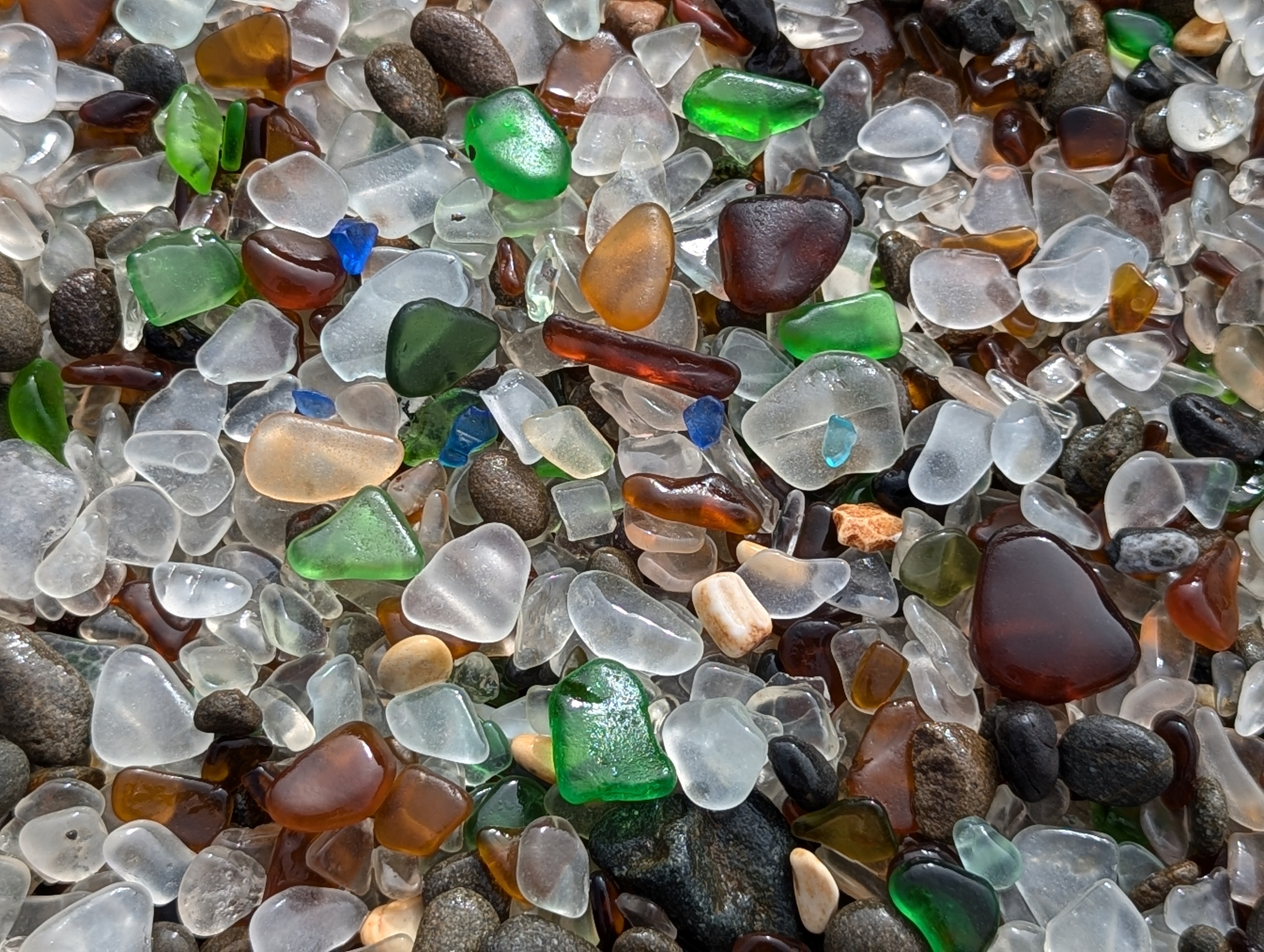 From 1906 to 1967, this area was used as a dumpsite for glass bottles, jars, and other debris. Over time, the glass was smoothed and polished by the tides, turning into the colorful sea glass that we see today. There are signs along the path that say it is unlawful to take any glass from the Sea Glass Beach as it is now considered a natural resource and protected by the state of California. The locals mentioned that it has been picked over so much through the years that it is hard to find the rare colors. Mainly what is left is white glass, brown bottled glass, green glass pieces and a few blue shards are left. Oh how I would have loved to take a few pieces home, but we only took pictures and found a few places in town that sold sea glass that we could take home legally. The Sea Glass Museum in Ft. Bragg is a wonderful place to see a display of all the colors of sea glass and they have a nice little gift shop with faux tumbled glass plus a few authentic pieces that you can purchase.