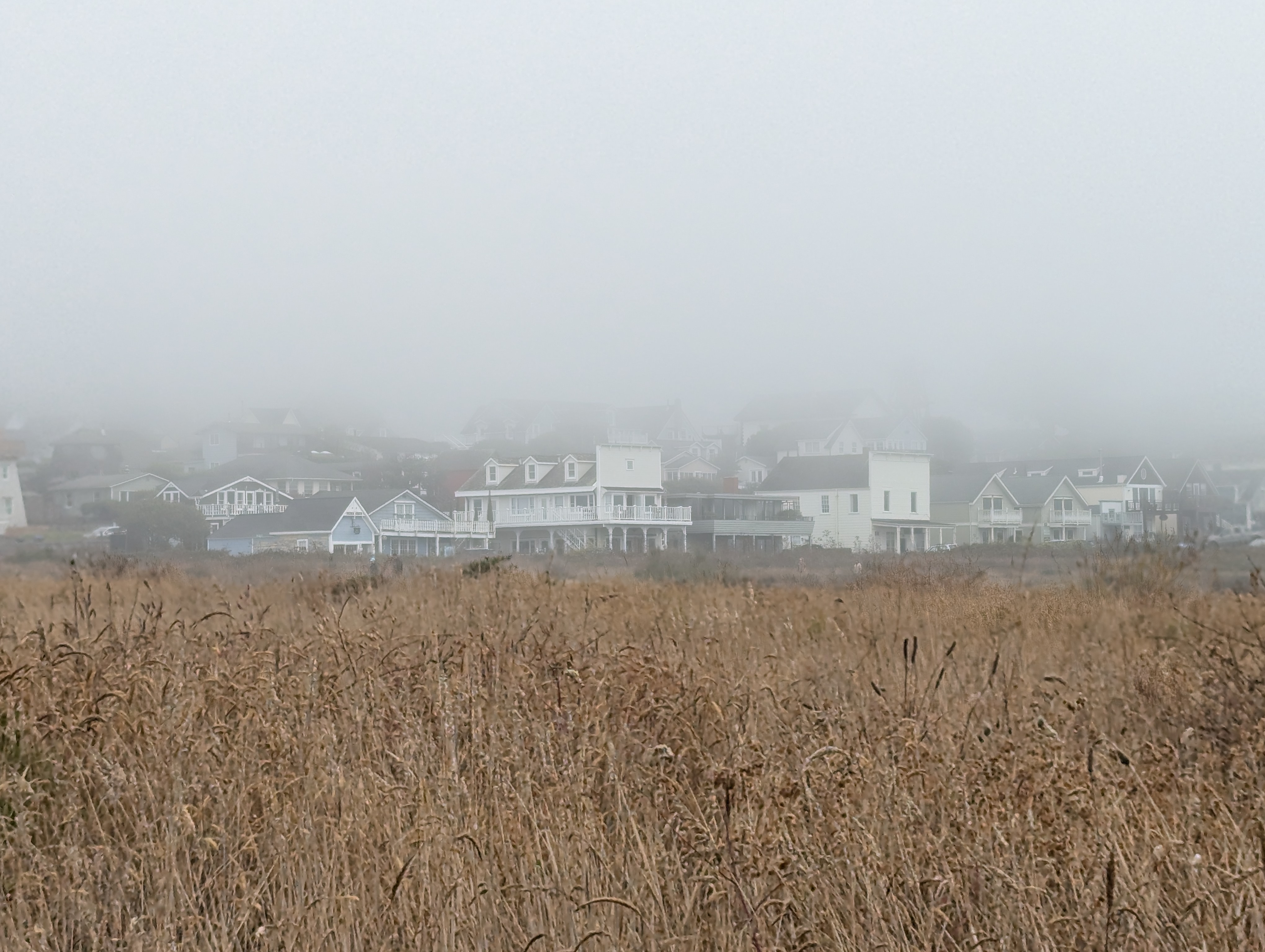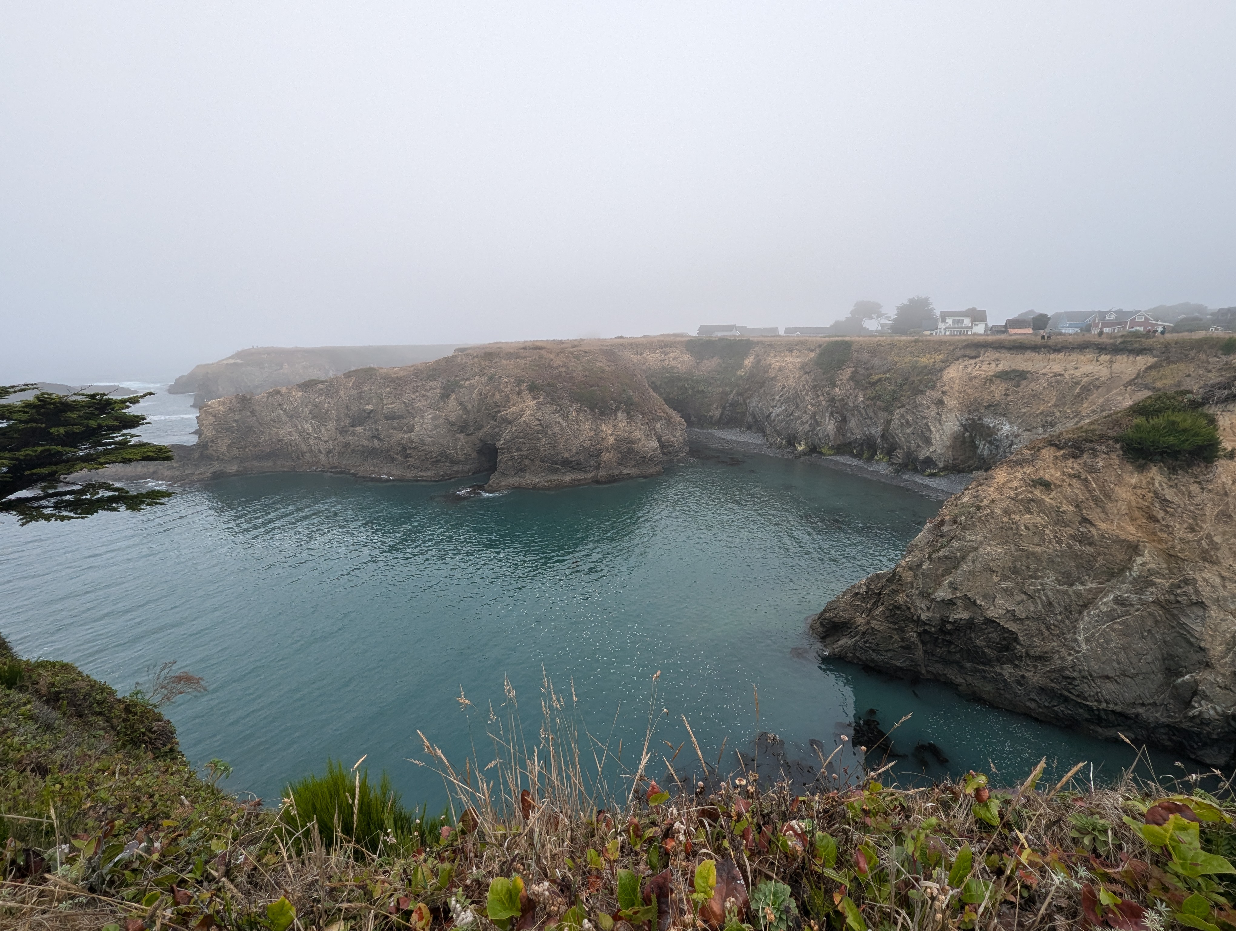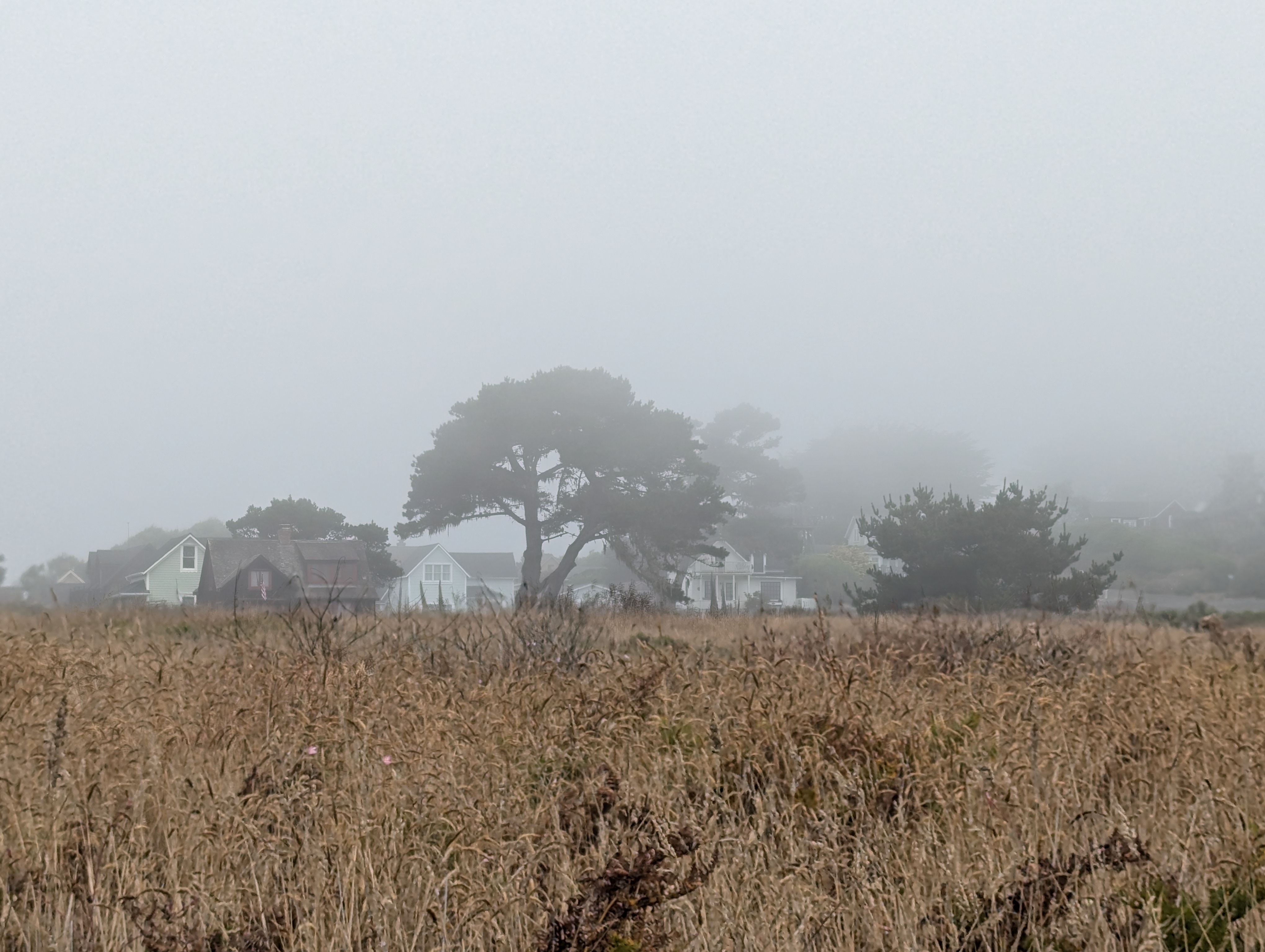 As we made our way over to the trailhead, a Raven came nearby and posed for me. The fog was thick and hard to see but was mesmerizing at the same time. The dew on a spider web was beautifully crafted in the tall grass with the town of Mendocino in the distance as we looked back on it.