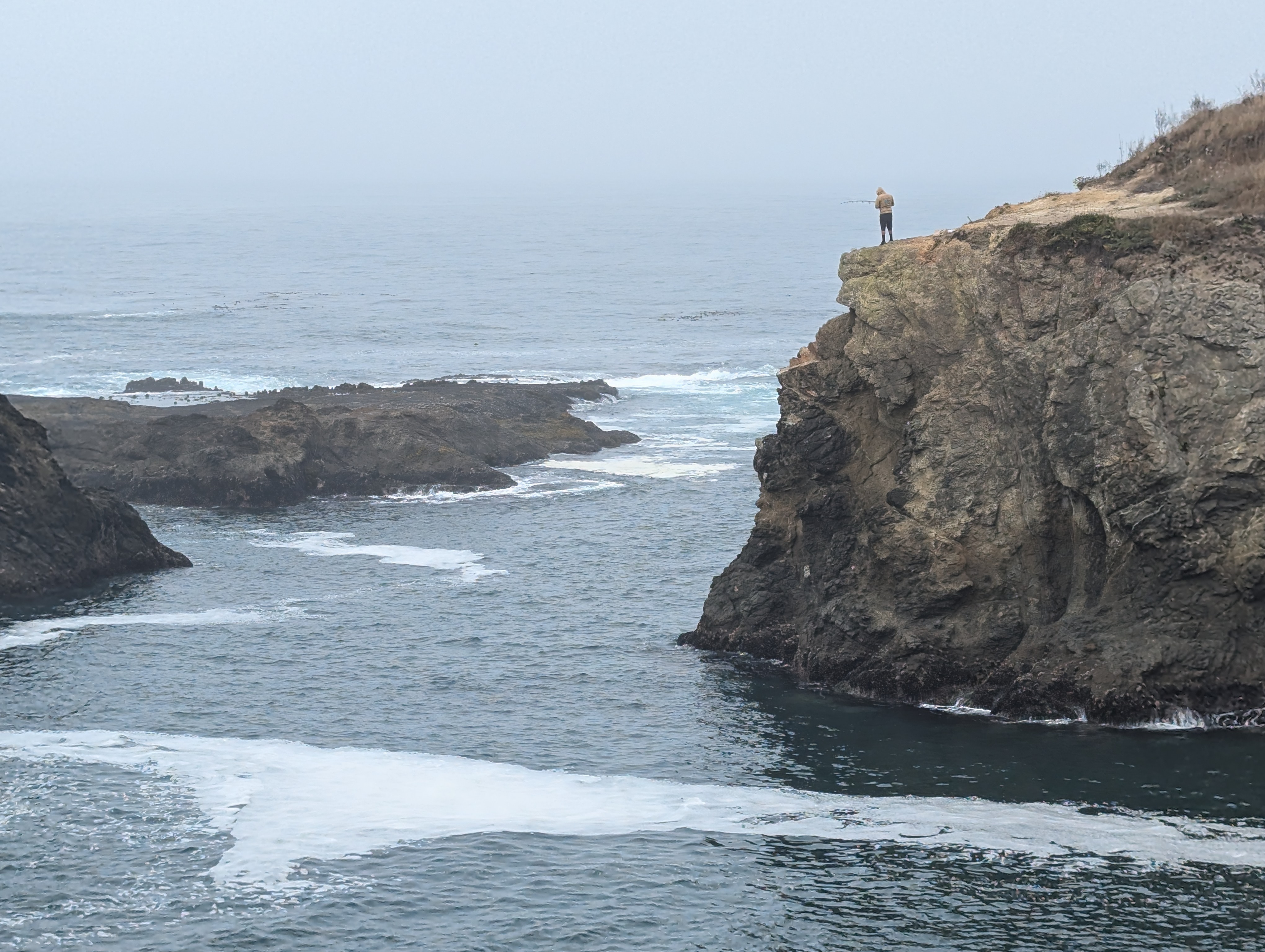 The trail along the Mendocino cliffs are like traveling along the winding road of Hwy 1. We traveled back and forth with many arches and caves carved into the rocks. It was a Saturday and there were more tourists in the area on the trails as well as local fishermen casting their line off the side of a bluff.