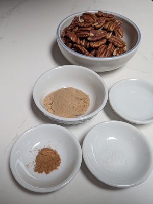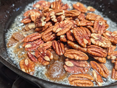 Add the water and pecans. Stir the pecans until they are completely coated.