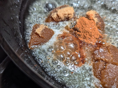 In an 8 inch skillet (cast iron works great), melt the butter over medium high heat. Add the brown sugar.