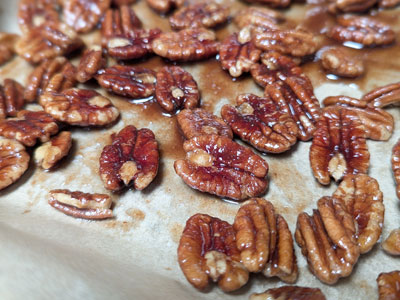 Line a baking sheet with parchment paper and pour the pecans on top in a single layer. Allow the pecans to cool. The coated pecans will taste really good on top of your salad.