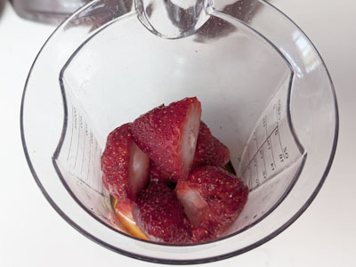I like to make the vinaigrette first so it has time to sit in the fridge and let all the flavors come together. Start with a few strawberries, either fresh or frozen will work. I used 5 large frozen strawberries.