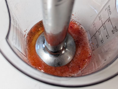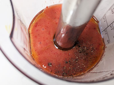 I used a hand blender to make the vinaigrette but if you don’t have one, a small food processor or blender will do. Place the strawberries into the cup or bowl and blend.