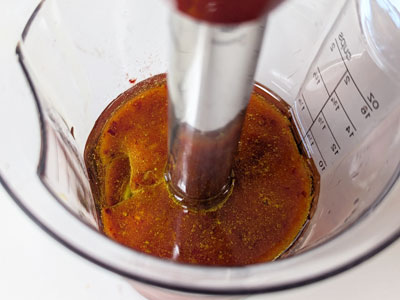 Season with some salt and pepper. Continue to blend until the vinaigrette is emulsified.