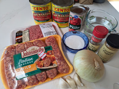 Starting with the meat sauce, you’ll need approximately 1 pound each of lean ground beef and Italian sausage. Also a large chopped onion, 2 – 3 cloves of garlic, sugar, cayenne pepper, a bay leaf and salt to taste. You’ll want good canned Italian whole peeled tomatoes, tomato paste and some water to reach the consistency needed. You’ll add some fresh basil and parsley which will come later.