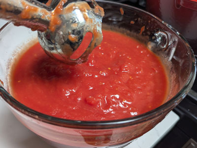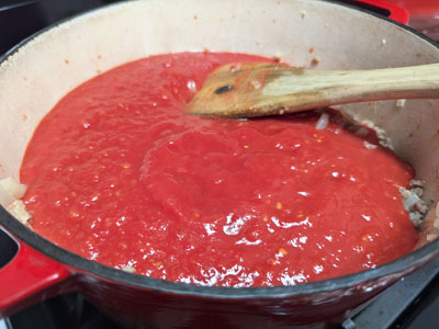 Use a hand blender to break apart and crush the tomatoes. If you don’t have a hand blender, try a potato masher, it works well in a pinch.