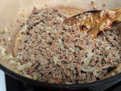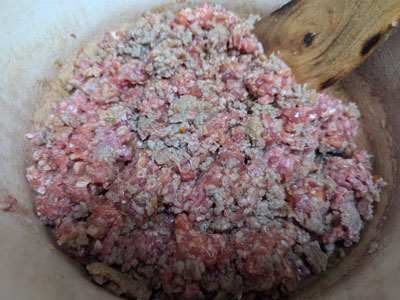 It will take a few minutes to brown all the beef and sausage together. Continue stirring the pot and chopping the meat as it continues to cook.