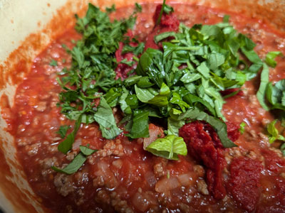 Add the tomato paste, chopped basil and half of the parsley. Stir the pot.
