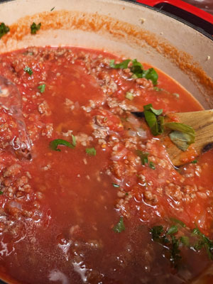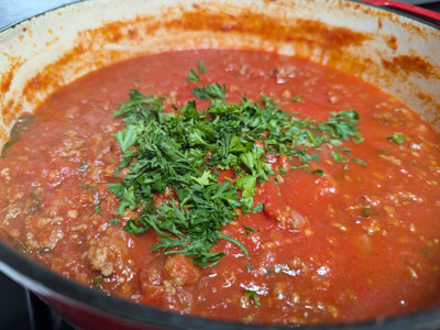 Turn the heat down to medium under the Dutch oven and add the chopped onions with a drizzle of olive oil. Use a microplane grater to grate 2 – 3 large cloves of garlic and add to the pot. Stir the onion/garlic mix as it begins to soften and become fragrant. Add the browned meat back to the pot along with the crushed tomatoes, tomato paste, water, sugar, cayenne pepper, bay leaf, fresh basil and 2 tablespoons of the fresh parsley. Stir the pot to incorporate all the ingredients and bring to a boil. Turn the heat down to a simmer and let cook for an hour uncovered or until the sauce has thickened. Add the remaining 2 tablespoons of chopped parsley to the sauce about 15 minutes before the end of your cook time. Taste and add salt if needed. Remove bay leaf from the sauce before assembling.
