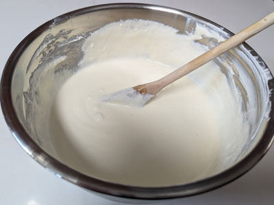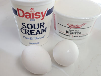 Combine the ricotta cheese, sour cream, eggs and salt together. Stir until the mix becomes creamy. Set aside in the fridge if not using immediately.