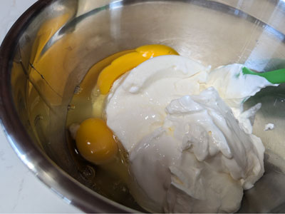 While the meat sauce is simmering, it’s time to make the ricotta cheese filling. You’ll want whole ricotta, whole sour cream, 2 eggs and a sprinkle of salt.